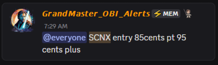 It started early this morning when Grandmaster-Obi issued a real-time alert on $SCNX in his Making Easy Money Discord server at an entry price of $0.85.